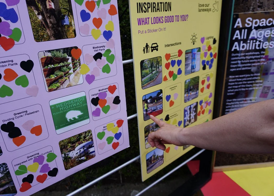 Love Our Laneways was a pilot project led by A Playful City in partnership with Dún Laoghaire Rathdown County Council (DLRCC), aimed at revitalising Pearse Drive Laneway—locally known as “the Gaps”—in Sallynoggin. Faced with challenges such as poor lighting, uneven surfaces, safety concerns and neglect, the laneway was, underused and uninviting. The project engaged the local community and key stakeholders through workshops, surveys and meanwhile use trialling to co-create a shared vision for a safer, greener and more accessible public space that reflects community aspirations.